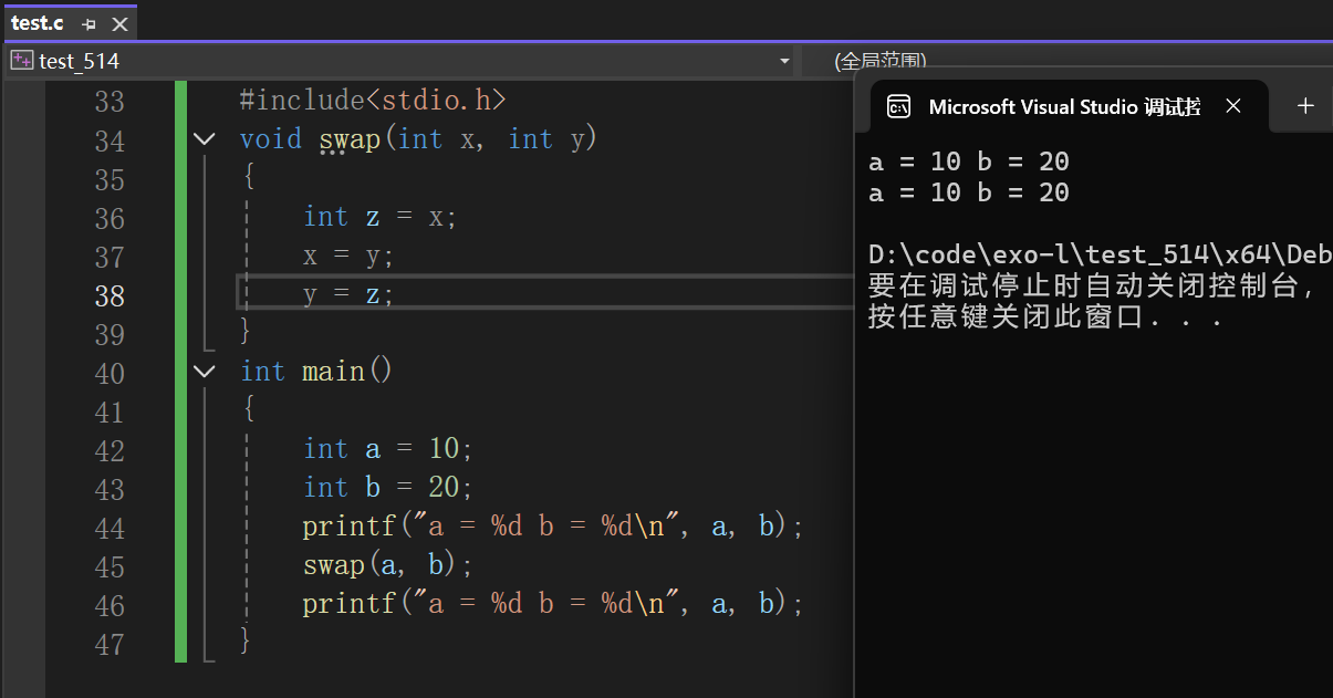 我们发现在main函数内部,创建了a和b,a的地址是0x0000001e9baff954,b的地址是0x0000001e9baff974,在调用swap函数时,将a和b传递给了swap函数,在swap函数内部创建了形参x和y接收a和b的值,但是x的地址是0x0000001e9baff930,y的地址是0x0000001e9baff938,x和y确实接收到了a和b的值,不过x的地址和a的地址不一样,y的地址和b的地址不一样,相当于x和y是独立的空间,那么在swap函数内部交换x和y的值,自然不会影响a和b,当swap函数调用结束后回到main函数,a和b的没法交换。swap函数在使用的时候,是把变量本身直接传递给了函数,这种调用函数的方式我们之前在函数的时候就知道了,这种叫传值调用。