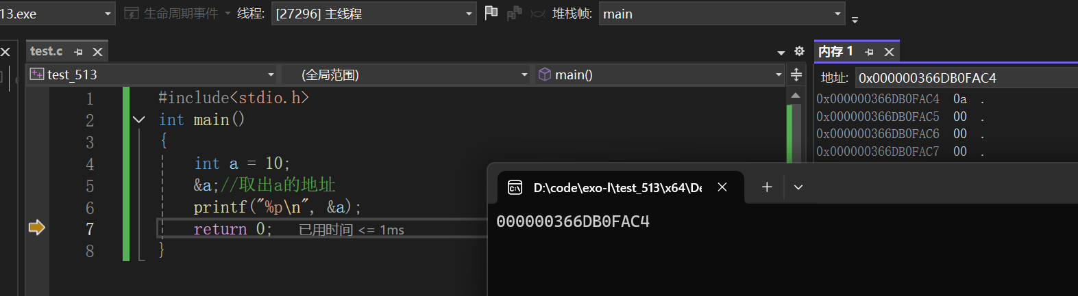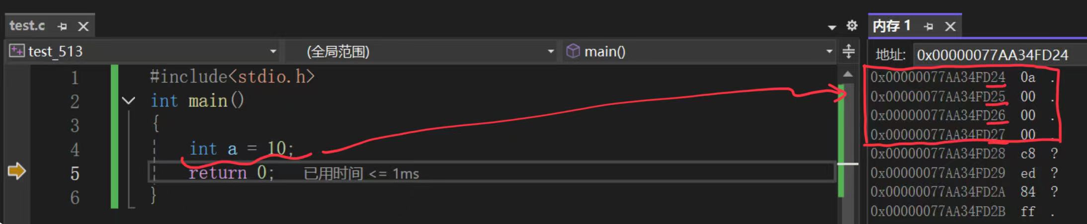 上述的代码就是创建了整型变量a,内存中申请4个字节,用于存放整数10,其中每个字节都有地址,上图中4个字节的地址分别是:0x00000077AA34FD24、0x00000077AA34FD25、0x00000077AA34FD26、0x00000077AA34FD27。