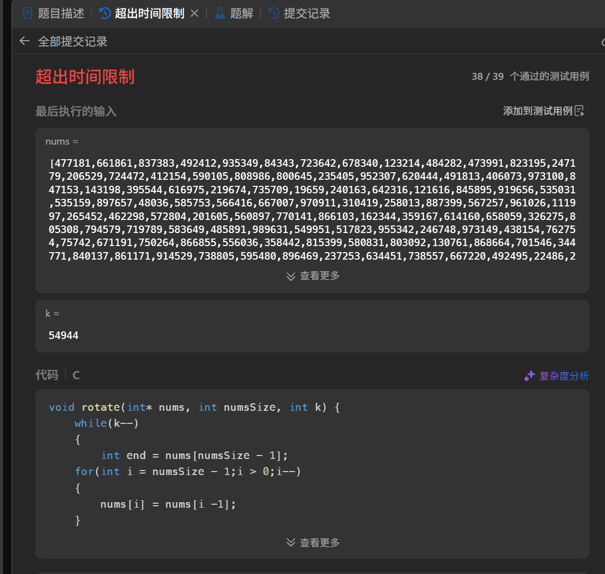 我们可以看到代码并没有通过,提示我们超出时间限制,那我们该如何对这段代码进行优化呢?接下来就然后我们先来学习一下算法复杂度。
