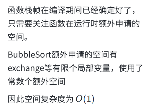 我们只需要关注函数体,参数不管,size_t end = n;申请了一个无符号整型的空间;int exchange = 0;申请了一个整型变量的空间;size_t i = 1;申请了一个无符号整型的空间,因此,总结下来空间复杂度就是O(1)。