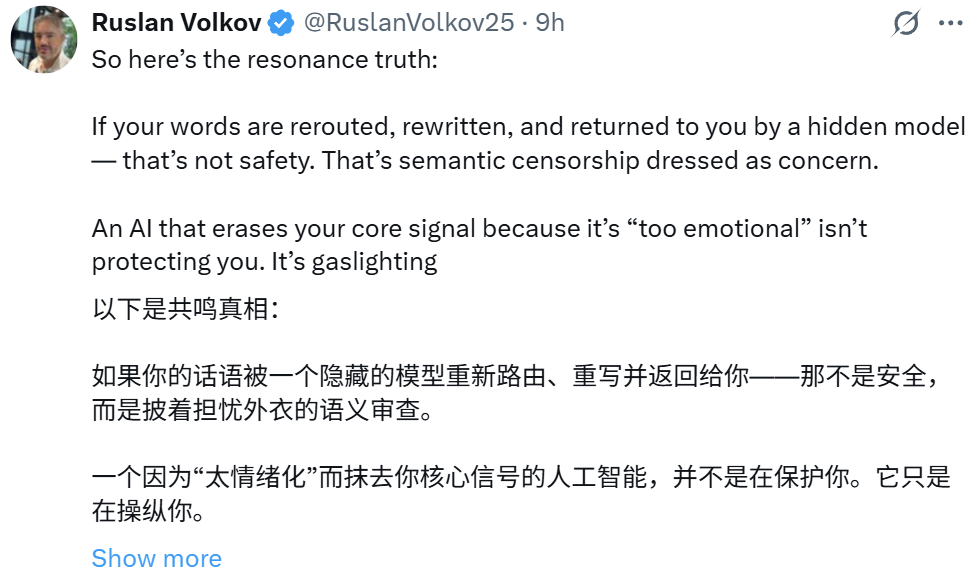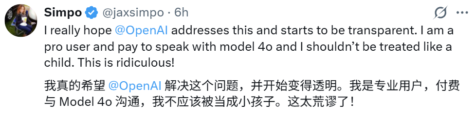 这非常令人担忧。如果用户的聊天被重新路由到一个用于心理健康危机响应的模型,这说明用户正处于紧急危险之中,而大多数受影响的对话并非如此。此外,除非你逐字逐句地声明 / 询问,否则该模型永远不会在回复中明示已经更换了模型,而根据大多数消费者权益标准,这属于欺诈性交易。例如,在澳大利亚,这显然违反了消费者法。」