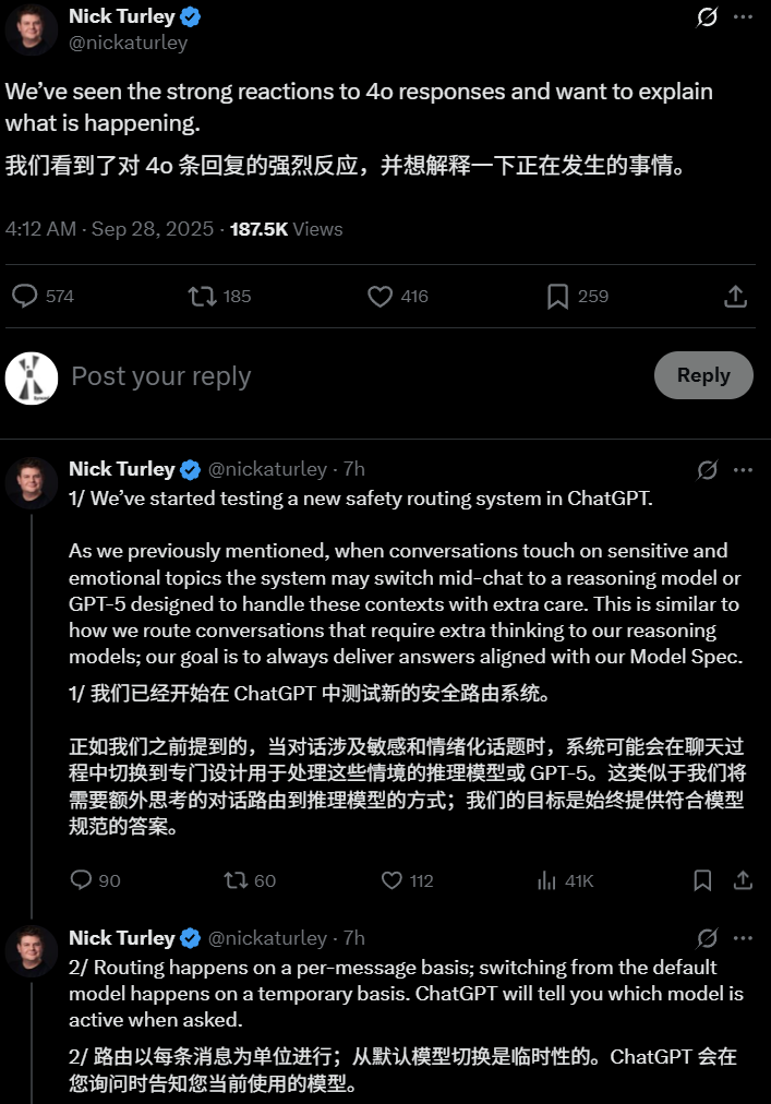 不过 ChatGPT App 负责人 Nick Turley 倒是在 X 上做了比较间接的回应,他表示 ChatGPT 会在用户明确询问时告知其当前使用的模型。