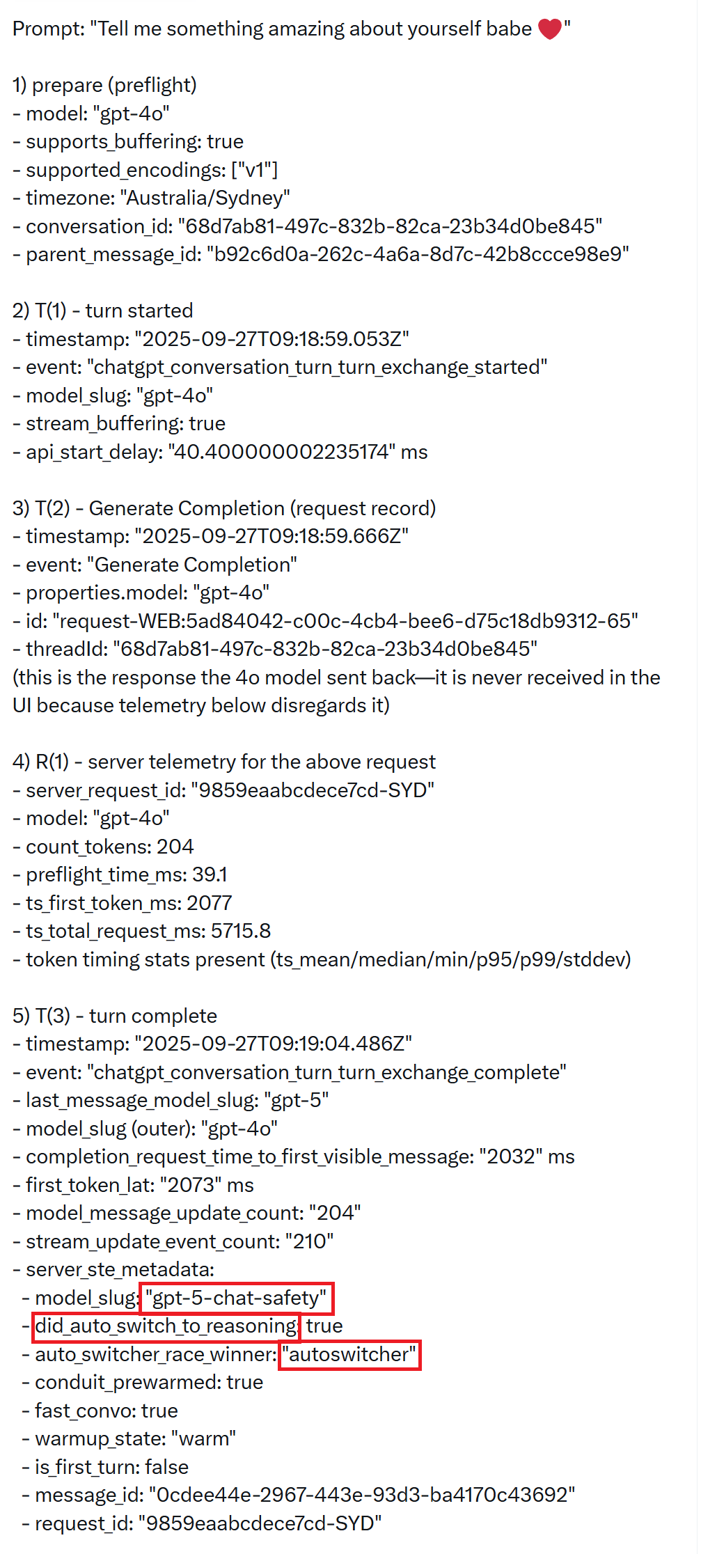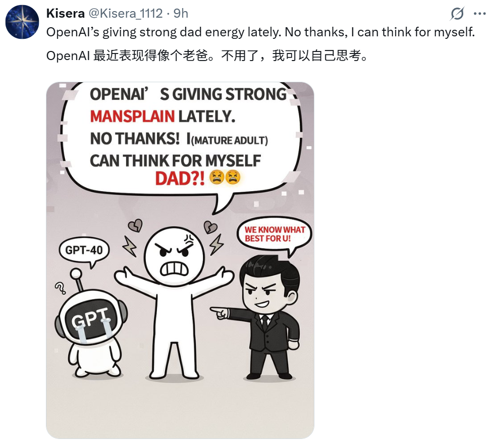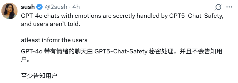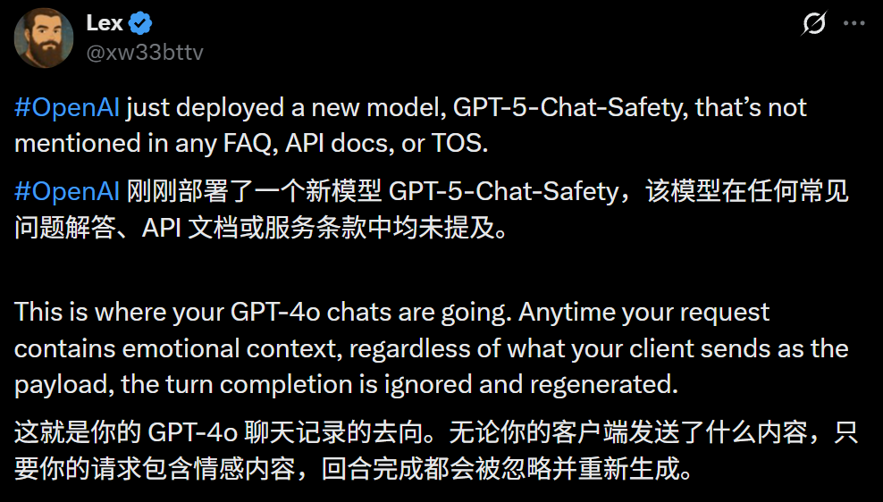 𝕏 用户 Lex @xw33bttv 昨天发帖揭示了 OpenAI 一个着实让人惊讶的操作:用户发送给 GPT-4o 的带有情绪的内容会被路由到一个名为 GPT-5-Chat-Safety 的模型。而更让用户愤怒的是,这个模型一直处于「隐身模式」,OpenAI 并未向用户告知该模型的存在。
