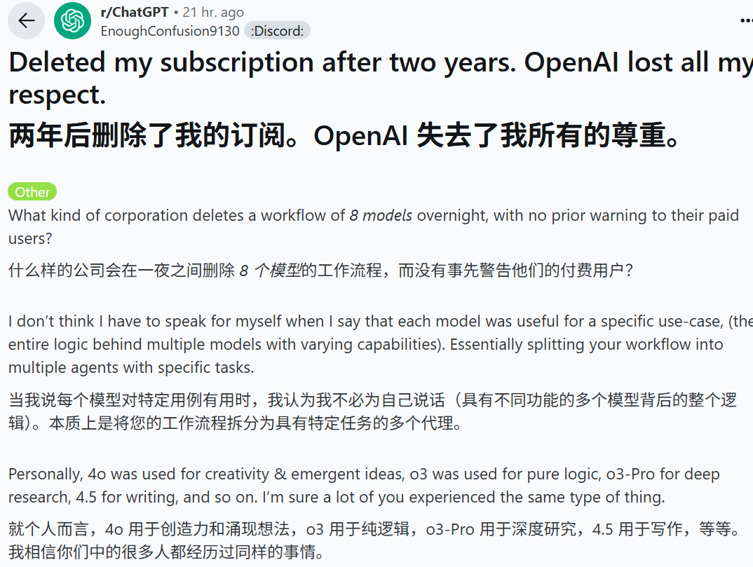 一位用户在 Reddit 愤怒发帖表示 OpenAI 的做法让他直接取消了订阅,并称「OpenAI 失去了我所有的尊重」。他指出,这些模型本有特定用例。「什么样企业会连夜删除 8 个功能各异的模型,连付费用户都不提前通知?…… 就我个人而言,4o 负责创意发散,o3 处理纯逻辑问题,o3-Pro 用于深度研究,4.5 专职写作…… 尽管 OpenAI 声称系统会自动分配模型,但这仍剥夺了用户直接掌控权。」