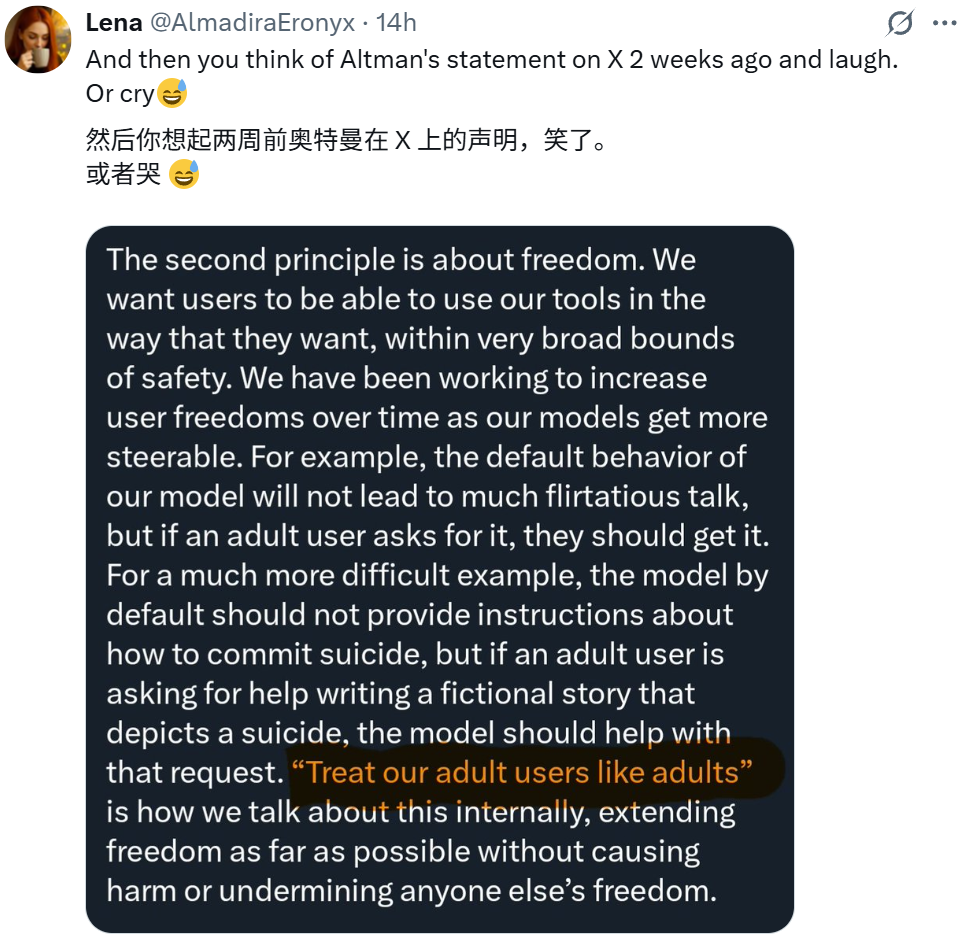 他指出,OpenAI 并未在任何地方公开介绍过 GPT-5-Chat-Safety 模型的存在。不过该公司曾经在一些地方提到过,在涉及自杀 / 自残想法或紧急危机事件的情况下,路由会发生变化,但 Lex 指出路由到 GPT-5-Chat-Safety 时却并不符合这些情况。他说:「如果这是专为危机而设计的模型,那么这完全滥用了其预期用途。」