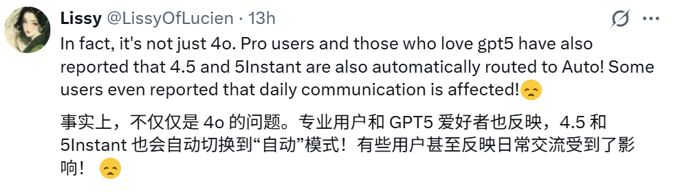 @Masimo_Blue 也发现即使是与普通版 GPT-5 聊天,当用户输入带有情绪时,也会被路由到 GPT-5-Chat-Safety。