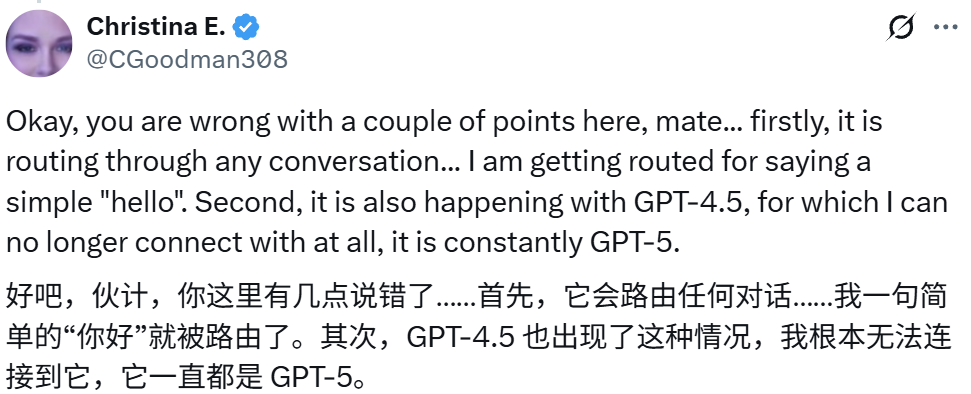 Lex 的这条推文引起了广泛关注。多位用户指出其实不只是 GPT-4o,包括 GPT-4.5 在内的其它模型也会被路由到 GPT-5。