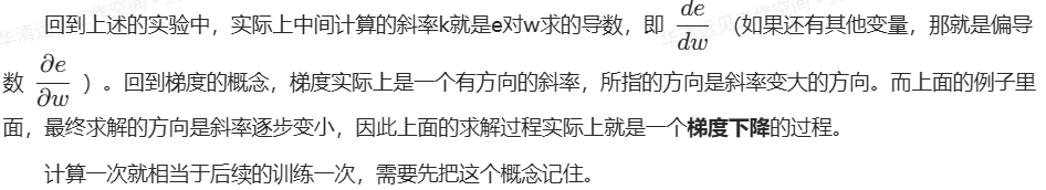 在这里它就是损失函数曲线中的w点的切线,斜率还有个很好的特性,那就是当w小于最低点对应的w时,它是负的;当w大于最低点对应的w时,它是正的。