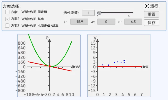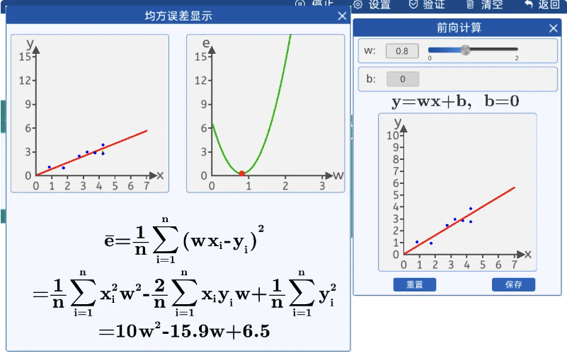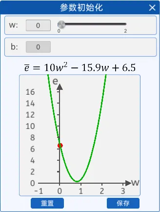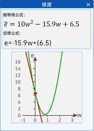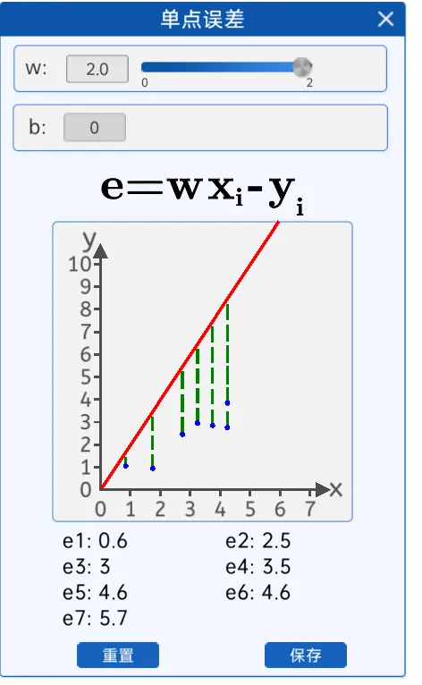 也就是说,我们是用一条过原点的直线来拟合这些散点,在该组件中修改w的值可以实时看到直线与散点的位置关系。