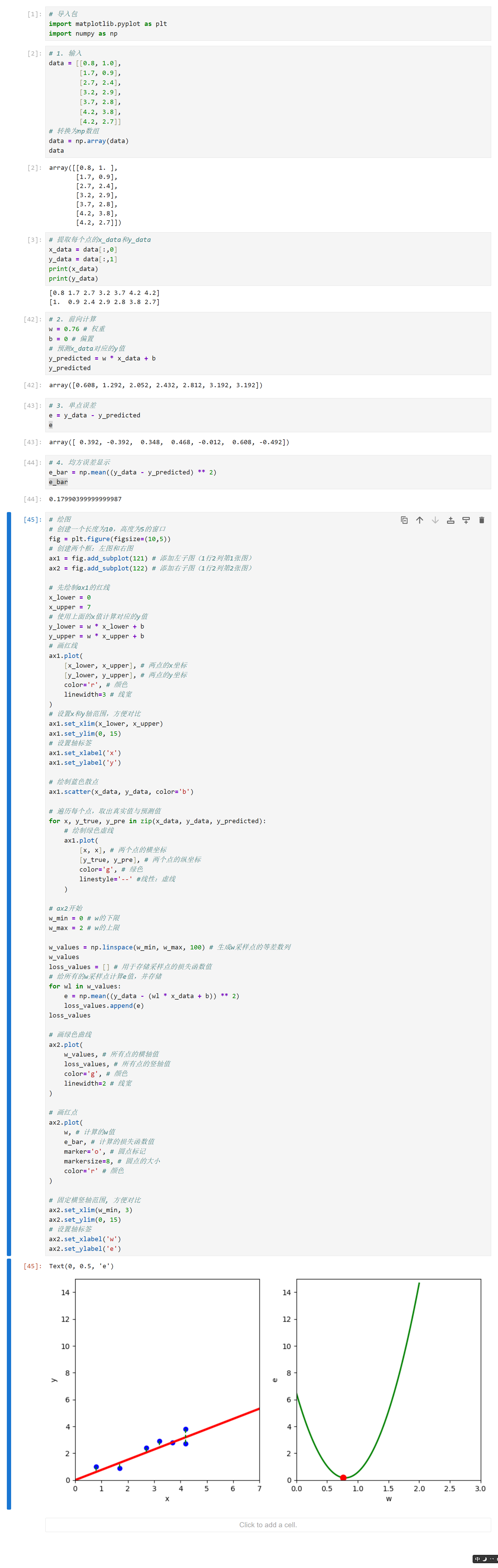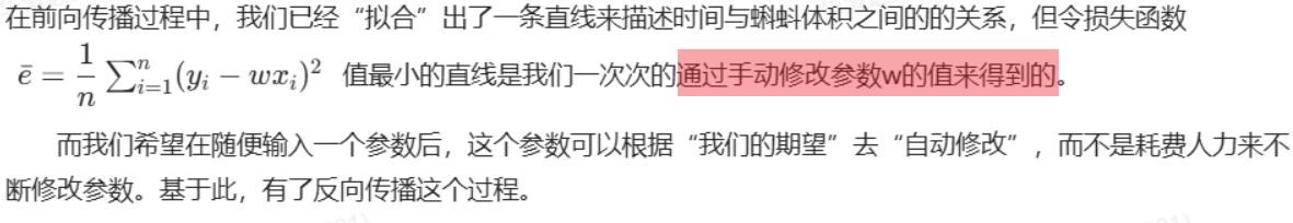 前向传播是在参数固定后,向公式中传入参数,进行预测的一个过程。当参数值选择的不恰当时,会导致最后的预测值不符合我们的预期,于是我们就需要重新修改参数值。在前向传播实验中时,我们都是通过手动修改w值来使直线能更好的拟合散点。