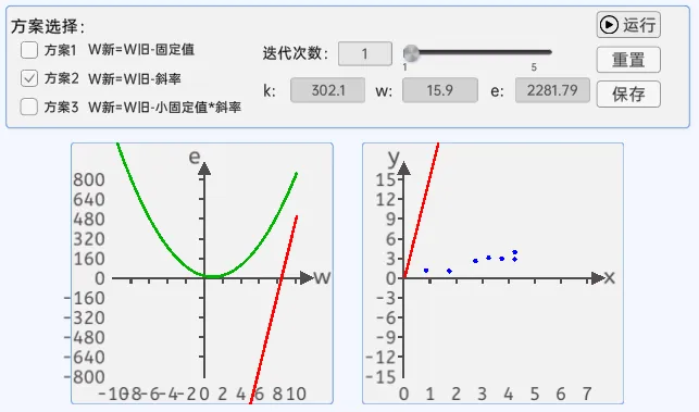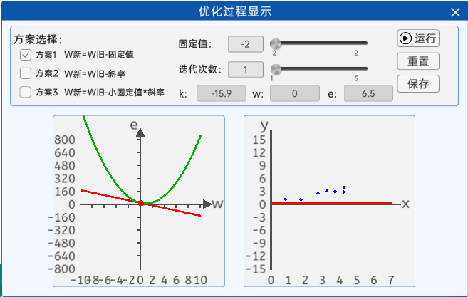在损失函数关于w的表达式中,确实存在一个w,使得损失函数的值最小。下面使用三种方案,包括固定值法、斜率法、小固定值*斜率法,展示一下其不同的优化效果。