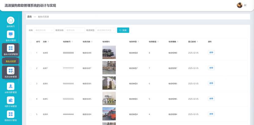 管理员点击导航栏中的救助资源管理按钮,跳转到救助资源信息列表界面中,管理员可以对救助资源信息进行管理,包括添加,删除,修改等操作。点击新增按钮,添加完成后,可以对救助资源信息进行查看,修改,删除等操作。