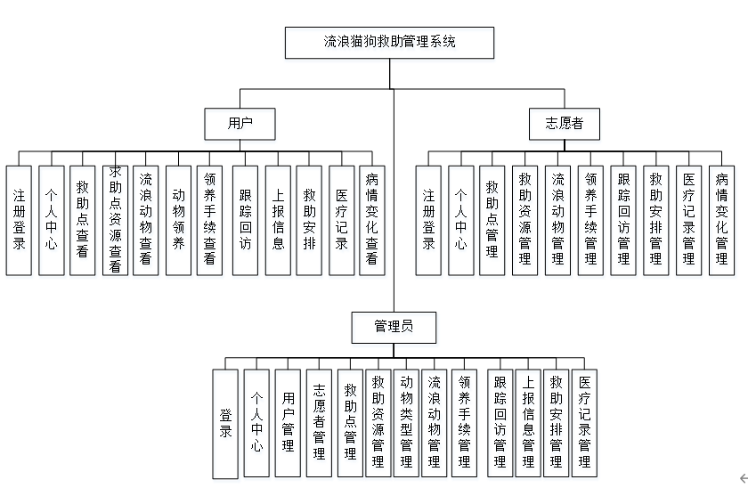 随着社会文明的进步和人们对动物保护意识的增强,流浪猫狗问题日益受到社会关注。为了更有效地管理和救助流浪动物,提高救助效率和领养透明度,我们设计并实现了一款流浪猫狗救助管理系统。该系统旨在通过信息化手段,整合救助资源,优化救助流程,为流浪动物提供及时、有效的救助,同时方便用户、志愿者和管理员进行信息共享和操作管理。本系统采用Java语言作为开发语言,结合SpringBoot框架构建后端服务,前端采用Vue框架进行开发,数据库选用MySQL进行数据存储。系统实现了用户、志愿者和管理员三类角色的注册登录、个人中心管理等功能。用户可以查看救助点、求助点资源、流浪动物信息,进行动物领养、领养手续查看、跟踪回访等操作。志愿者可以管理救助点、救助资源、流浪动物等,进行领养手续、跟踪回访、医疗记录等管理。管理员则拥有全面的管理权限,包括用户管理、志愿者管理、救助资源管理、动物类型管理等,确保系统的高效运行和信息安全。本系统的开发不仅提高了流浪动物救助的效率和透明度,还促进了社会对流浪动物问题的关注和参与。通过信息化手段,实现了救助资源的有效整合和共享,降低了救助成本,提高了救助效果。同时,系统为志愿者提供了便捷的管理工具,激发了更多人参与到流浪动物救助事业中来。此外,系统的开发也为类似的社会公益项目提供了有益的参考和借鉴,推动了信息技术在社会公益事业中的应用和发展。