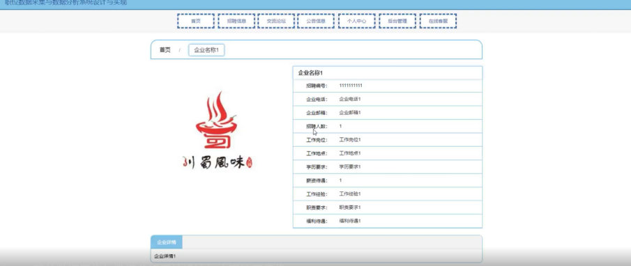 招聘信息;在招聘信息页面中可以对招聘编号、企业名称、企业电话、企业邮箱、招聘人数、工作岗位、工作地点、学历要求、薪资待遇、企业封面等内容并可查看企业详情;如图4-4所示。