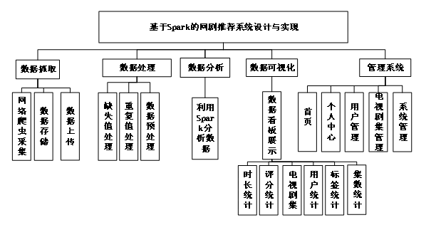 数据可视化功能使用ECharts、Vue、BootStrap等前端技术,对数据分析结果进行了可视化展示,以图表等可视化方式将数据展示,方便了用户分析和观察。系统功能模块图如图3-1所示。
