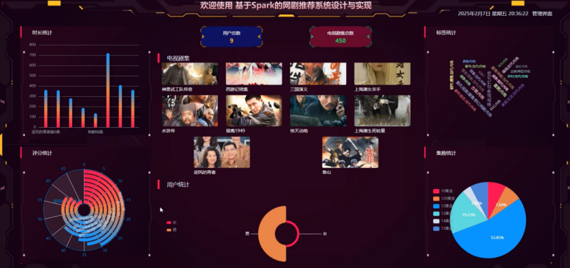 该数据可视化面板实现了多个关键功能模块,包括时长统计、评分统计、用户总数显示、电视剧总数量显示、电视剧集展示、标签统计、用户性别比例统计和集数统计。每个模块都直观地展示了不同的数据维度:时长统计柱状图显示了各时间段内的观看时长分布;评分统计雷达图呈现了不同评分区间的用户评价情况;用户总数和电视剧总数分别以数字形式清晰展示;电视剧集模块通过缩略图和标题展示了部分热门剧集;标签统计云图则以词频大小表示了各类标签的出现频率;用户性别比例环状图直观对比了男女用户的占比;集数统计饼图则展示了不同集数的电视剧所占的比例。可视化效果图如下所示:
