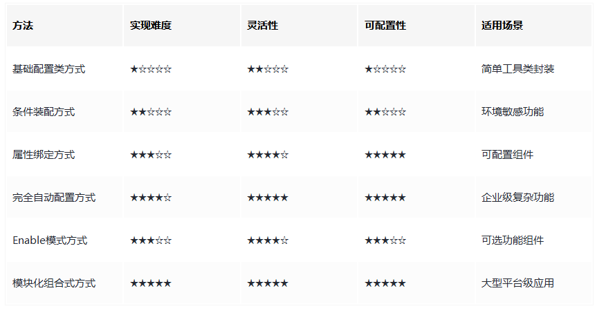 自定义starter是SpringBoot生态中重要的扩展机制,开发者可以根据不同的需求场景,选择合适的方式实现自己的starter。从简单的基础配置类方式,到复杂的模块化组合式方式,每种方法都有其适用场景和优缺点。