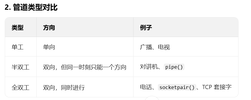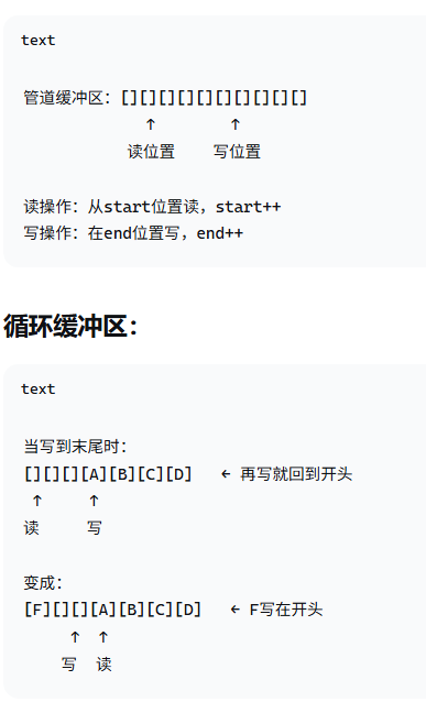 // 可视化理解:进程A → [写端] === 管道 === [读端] → 进程B(进水口) (出水口)
