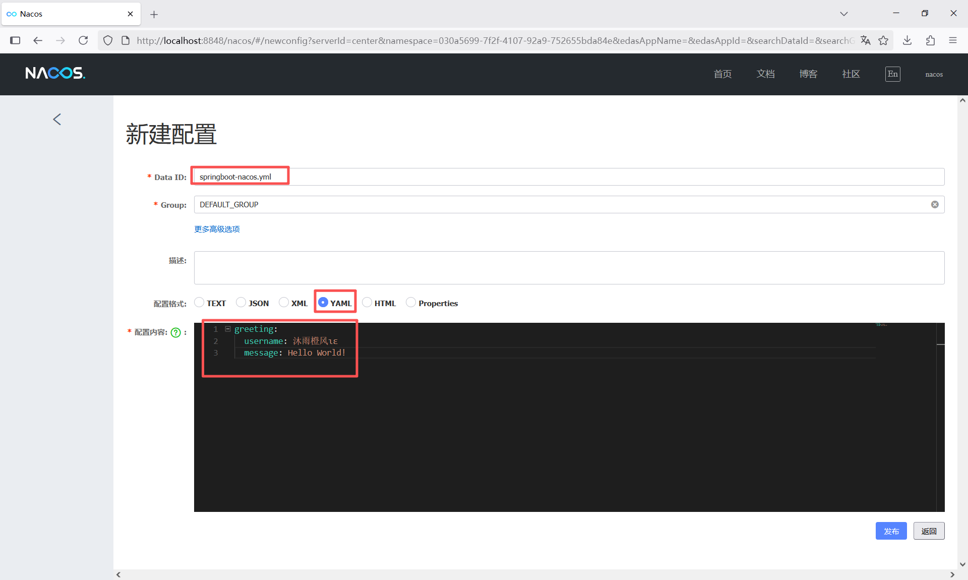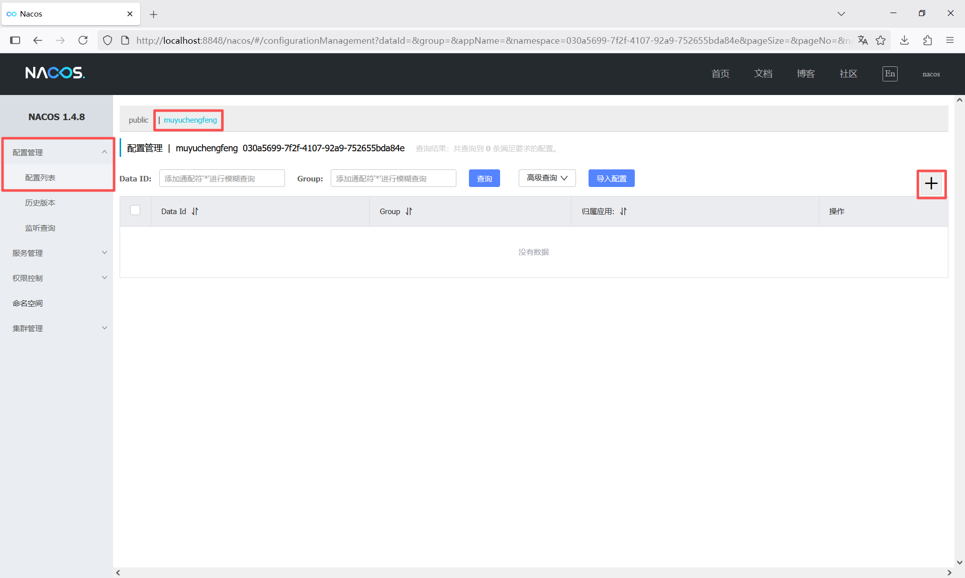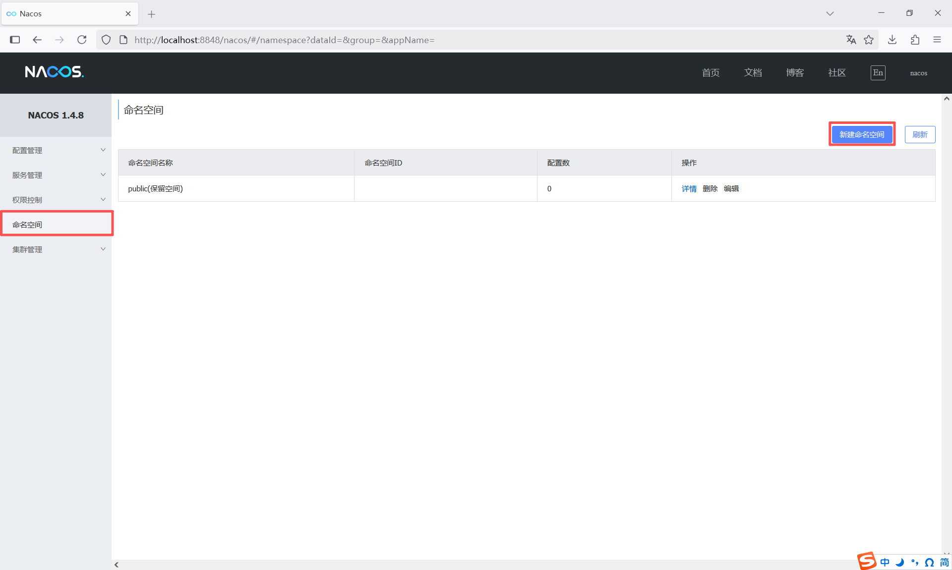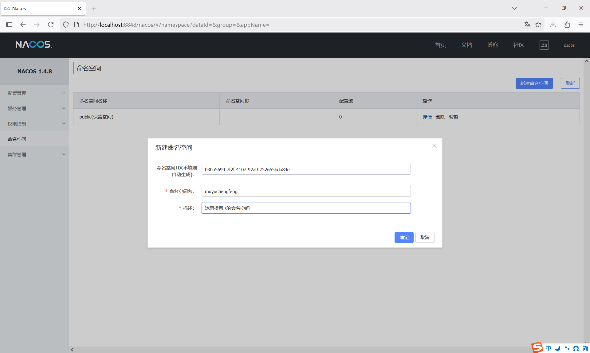 在nacos中新建命名空间,其中命名空间ID指定为: