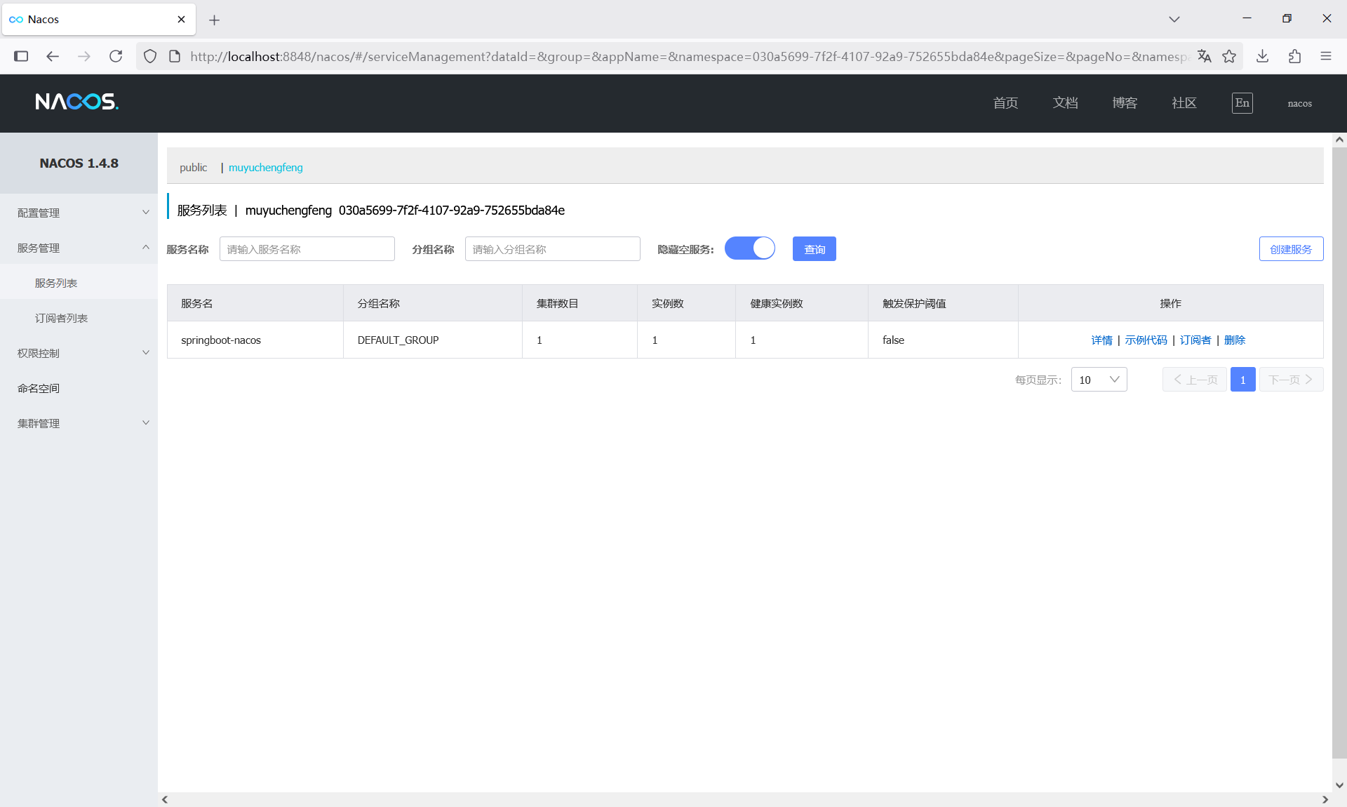 点击【服务管理】=>【服务列表】,可以看到启动的服务(应用)已经注册上来了。