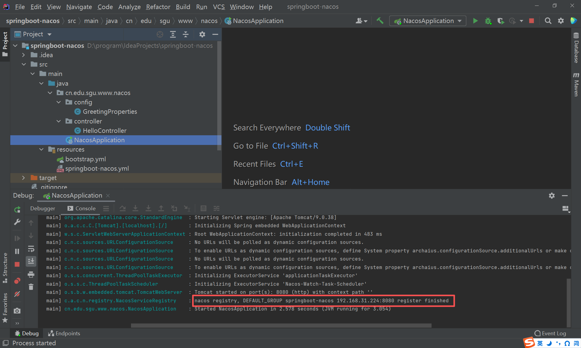 点击左上角的两个图标中任意一个,启动当前项目,下面红框是打印的成功注册到nacos的日志。