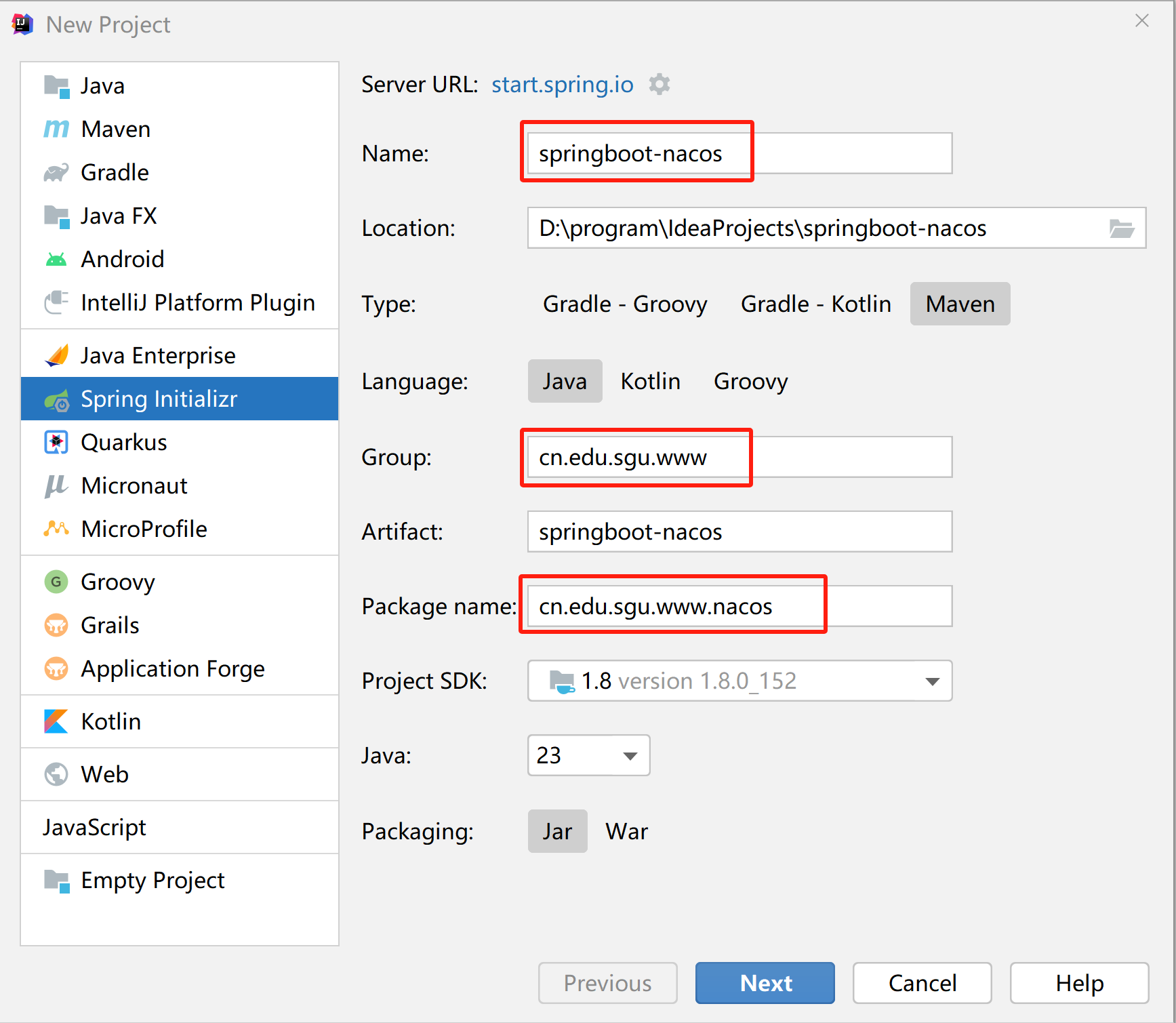 在Intellij IDEA中新建一个SpringBoot项目,项目名为springboot-nacos