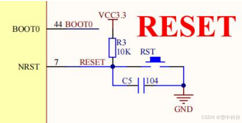 前面我们已经将晶振电路搭建完成,我们知道晶振犹如人的心脏,需要无时无刻给单片机提供运行周期。但即使时钟周期在不停的运行,系统也有可能会出现崩溃或者瘫痪状态。这就好比人会生病一样,人一生病就得看医生,服用医生开的药后重新获得正常状态。那么单片机呢,它是如何获取重生的?这就需要设计一个复位电路来实现此功能。我们知道 STM32 引脚中有一个NRST 复位引脚,而 STM32 是低电平复位,所以需要让这个引脚保持一段时间低电平就可以。要实现此功能通常有两种方式,一种是通过按键进行手动复位,还有一种是上电复位,即电源开启后自动复位。手动复位是通过一个按键及电容电阻所组成,利用按键的开关功能实现复位,按键按下后 GND 直接接入到单片机NRST 引脚,松开后GND断开,NRST 被电阻拉为高电平。这一合一开就实现了手动复位。而自动复位主要是利用 RC 充放电功能,电源开启,由于电容隔直,GND 直接进入NRST,然后电容开始慢慢充电,直到充电完成,此时 NRST 被电阻拉为高电平。这样就起到上电复位的效果。这里我们采用手动复位。不到系统崩溃,我们几乎不会操作复位。复位电路如下图所示:
