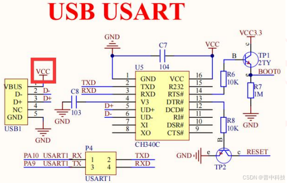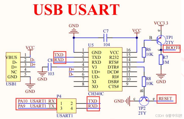 从上图可以知道,USB1 接口即为程序下载接口,D-和D+连接到CH340 芯片的 D-和 D+,然后 CH340 芯片的串口 TXD 和 RXD 管脚就连接到STM32 的串口1(PA9、PA10)上,这里不是直接连接到单片机串口,而是通过P4 端子进行转接。这样做不仅可以让开发板 USB 接口下载程序,还可以当成 USB 转TTL 模块使用,用来给其他单片机下载程序或调试外部串口设备,比如 WIFI、蓝牙、GPS 等。而且还有一点比较重要的是可以让 STM32 串口 1 不受 CH340 干扰。