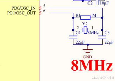 由于单片机正常工作需要一个时钟,对于 STM32 这种高级单片机来说,其内部自带高速时钟/低速时钟源。但通常我们不使用内部时钟源,而是在单片机主晶振引脚上外接一个晶振(STM32F103C8T6 芯片的主晶振管脚在5、6 脚位),至于需要多大晶振这就取决于你所使用的单片机,我们使用的是STM32F103C8T6,其时钟频率可在 0-72MHZ 上运行,一般情况下我们建议选择8MHz(适合 STM32 内部其他外设时钟的计算)。若直接将此晶振接入单片机晶振引脚,会发现系统工作不稳定,这是因为晶振起振的一瞬间会产生一些电感,为了消除这个电感所带来的干扰,可以在此晶振两端分别加上一个电容,电容的选取需要无极性的,另一端需要共地。根据选取的晶振大小决定电容值,通常电容可在10-33PF 值范围内选取。我们使用的是 22PF 电容。这样一来就构成了晶振电路。只有保证晶振电路稳定,单片机才能继续工作。其电路如下所示:
