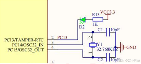 STM32 芯片上还有一个外设需要晶振,它是 RTC,这个在后面章节实验我们会专门介绍,这里先不用管它。要让 RTC 工作,通常外接一个32.768KHz 的晶振,其电路如下: