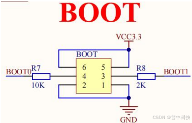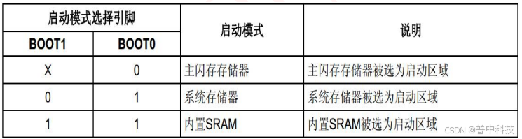 在 STM32F1 中,可以通过 BOOT[1:0]引脚选择三种不同启动模式,如下所示: