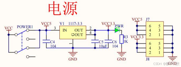 使用一个 USB 接口 USB1 作为电源输入端,插入电源后只需打开电源开关POWER 即可获得 5V 电源,同样 5V 电源通过 V1 稳压芯片转换成直流3.3V 供STM32系统及外部器件使用。开发板上还预留了 J7(5V)和J8(3.3V)端子,这些端子可以很方便的给外部模块连接电源。同时底板供电后也可给核心板供电。