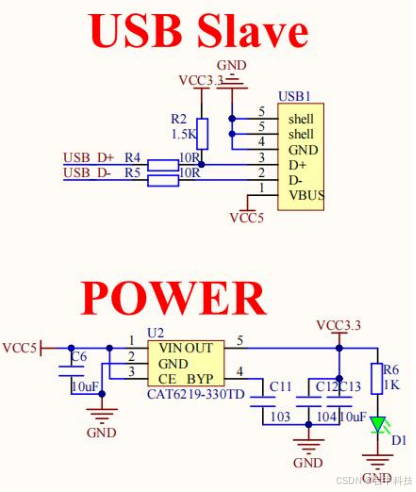 板上有 2 个 USB 接口,即核心板电路图中的 USB1 和底板电路图中USB1,其中核心板 USB1 接口有 2 种作用,第一种是当做 5V 电源输入口,第二种是STM32Slave USB 接口使用。底板 USB1 接口也有 2 种作用,第一种是当做5V 电源输入口,第二种是程序下载口(USB 转串口)。