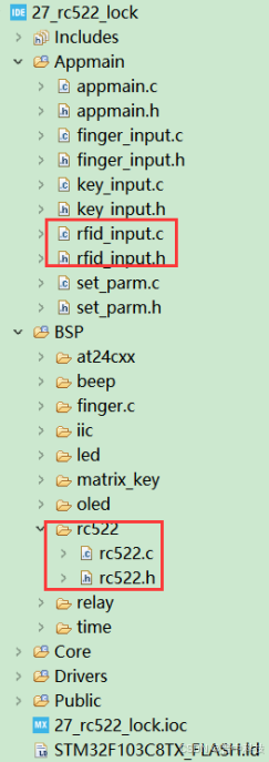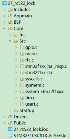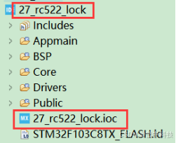 修改完之后,按下键盘的“Ctrl+S”组合键保存27_rc522_lock.ioc 文件,系统开始生成初始化代码。生成工程文件目录如下图所示: