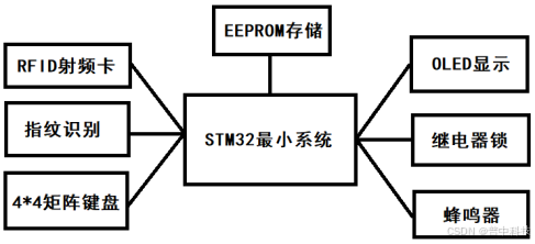 在我们智能门禁系统中主要实现密码键盘、指纹、RFID射频卡解锁。密码键盘可实现密码修改、删除,在修改或删除密码前需通过管理员密码校验方可操作;密码键盘还可以用于指纹添加、删除操作,RFID磁卡写入特定信息用于解锁。其结构图如下: