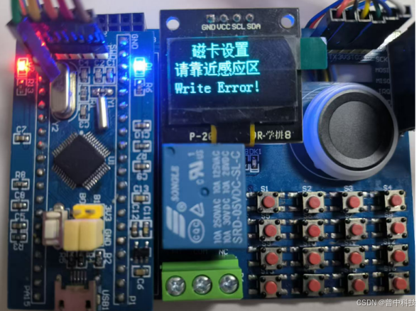 磁卡检测成功后,继电器触发,蜂鸣器响。