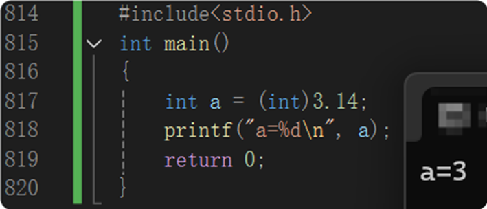 编译器默认3.14为double类型,在上述代码中我强制使3.14变成int型,并赋值给a,最终使得a只保留了整数部分。