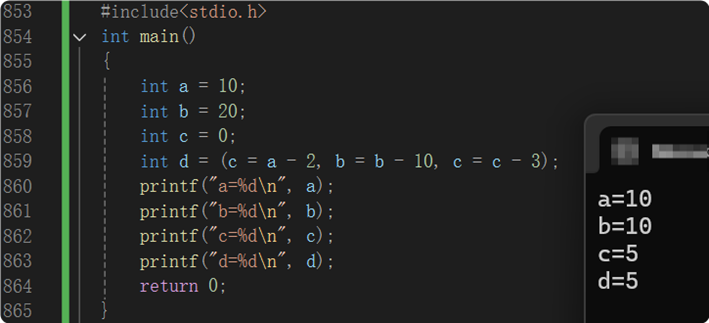 格式:exp1,exp2,exp3,exp4,exp5,……,最终把最后一个表达式的值作为输出,其它表达式也生效但不作为本句的输出使用。