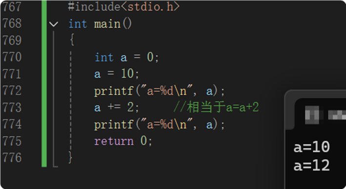 类似于a+=2相当于a=a+2,相应的其它赋值操作符转化格式也是一样的例如:a*=2相当于a=a*2。int a = 0;是初始化, a = 10;才是赋值。