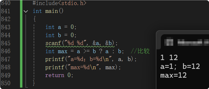 比较处代码的写法:int max = a >= b ? a : b;(int max = exp1 ? exp2 : exp3;)含义是:满足exp1,则输出exp2的值,否则输出exp3的值。