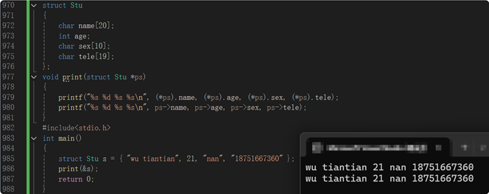 如图是用指针函数来进行打印的方式注意函数参数、和打印时的操作符:结构体指针变量->成员名(如ps->age)、结构体名.成员(如s.name)以及使用函数时输入的是指针,接收时同样要用结构体指针变量来接收。