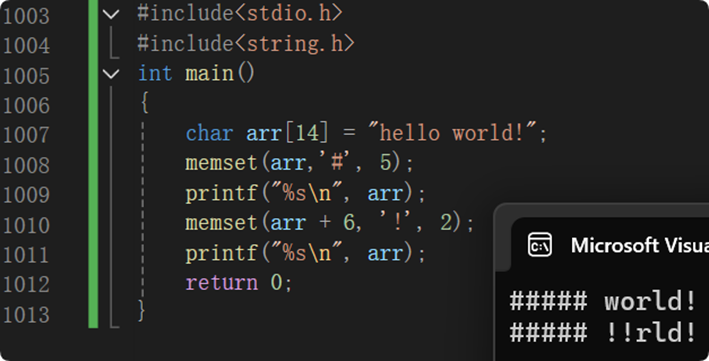 库函数memset(arr + 6,’!’,2)是指把字符串arr的(6,6+2]个字符改变为!,它的头文件为string。