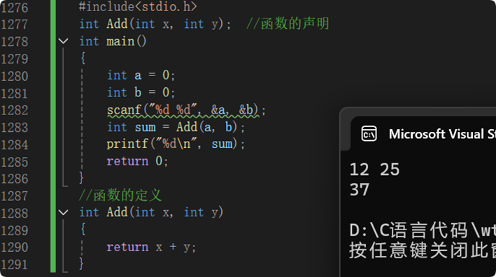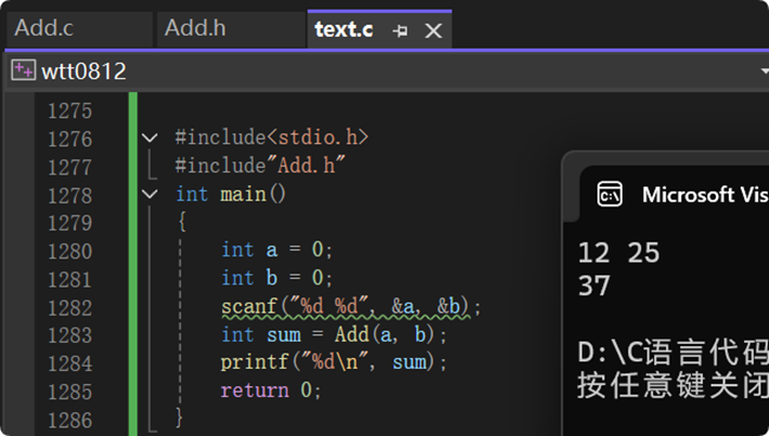 上述代码中我们将函数的声明放到了Add.h中,将函数的定义放到了Add.c中。我们在text.c中使用的时候只要包含头文件就可以像库函数那样使用了,只不过和库函数不同的是用””引用,而非<>。