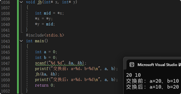 这时我们想到了指针,依据指针是地址的特性,我们传指针给函数,然后在函数内解指针,就能链接到函数外部的数据了,然后我们就可以实现两个数的交换了。当要修改实参时要用指针,当不需要改变实参时,则直接传值即可。