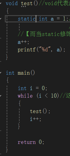 这段代码的输出结果是2到11的十个数字,如果没有static,输出结果应该是十个2,为什么呢?因为当没有static的时候,每次循环,a都会经历“创建a”➡️“a+1”➡️“销毁a”的三个阶段。这是由于a是个局部变量,它的生命周期就是test函数的生命周期,每次循环都是个独立的过程,调用完test函数时,a的数据不会继承到下一次循环中,因为它在每一次循环中都“死”过一次;那如果有了static呢?那a的“生前记忆”就保存到了静态区,每次循环就都可以调用,相当于“带有上一代记忆的投胎转世”,如此情况下,每一次循环,a的值都会较“上一代”加1,就会出现2到11的十个数字。