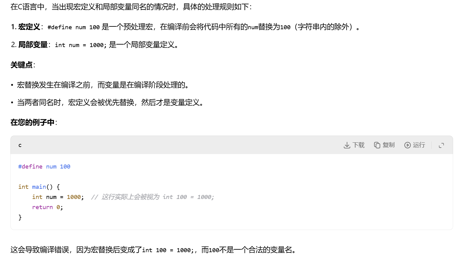 作用:定义常量时,就是给一个名字赋值,如#define num 100,则定义了num的值为100。但这里需注意一个问题:假设#define num 100,那如果在main函数里用num,num的值应该是100.但如果我在main函数里又定义了一个int num = 1000;呢?这时候是局部优先还是定义优先?