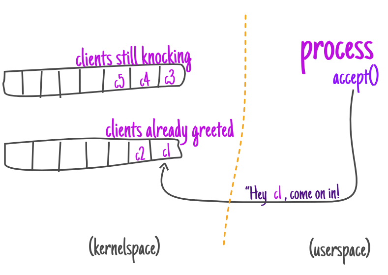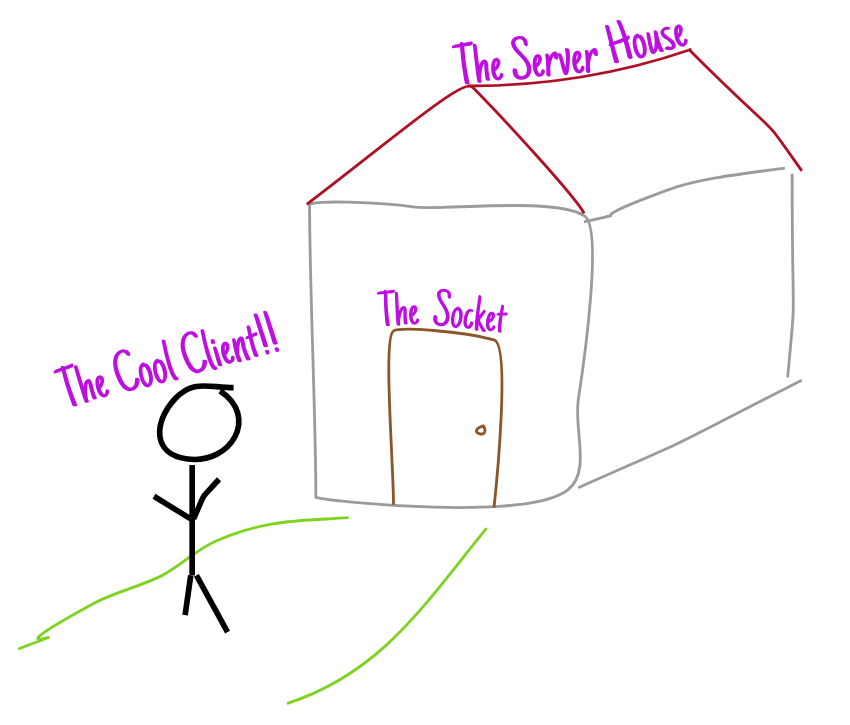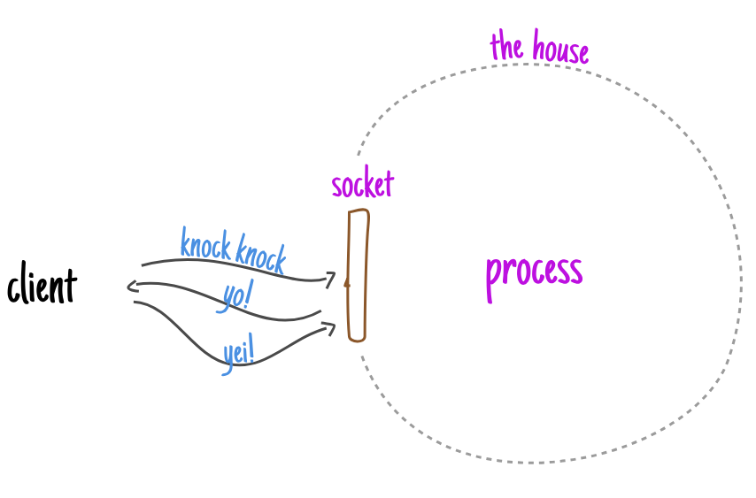 这里值得注意的是,客户端实际上“被禁止”进入房子。服务器在房子里创建了一个“私人门”(客户端套接字),然后通过它与客户端进行通信。