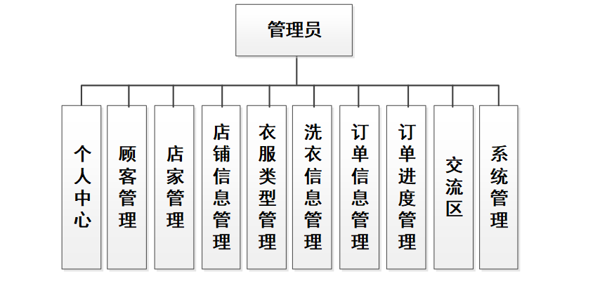 Administrator functions include personal center, customer management, store management, store information management, clothes type management, laundry information management, order information management, order progress management, communication area, system management, etc. Store functions include personal center, store information management, clothes type management, laundry information management, order information management, order progress management, etc.