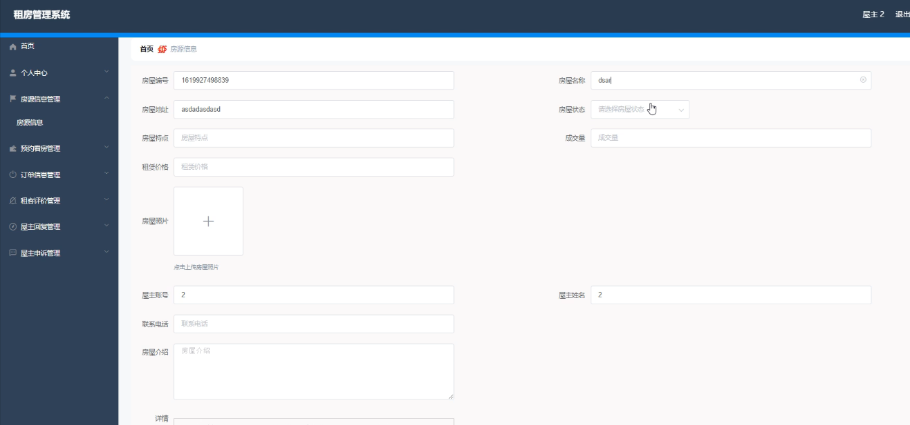 屋主可以对房源信息进行添加,修改,删除以及查询操作。界面如下图所示: