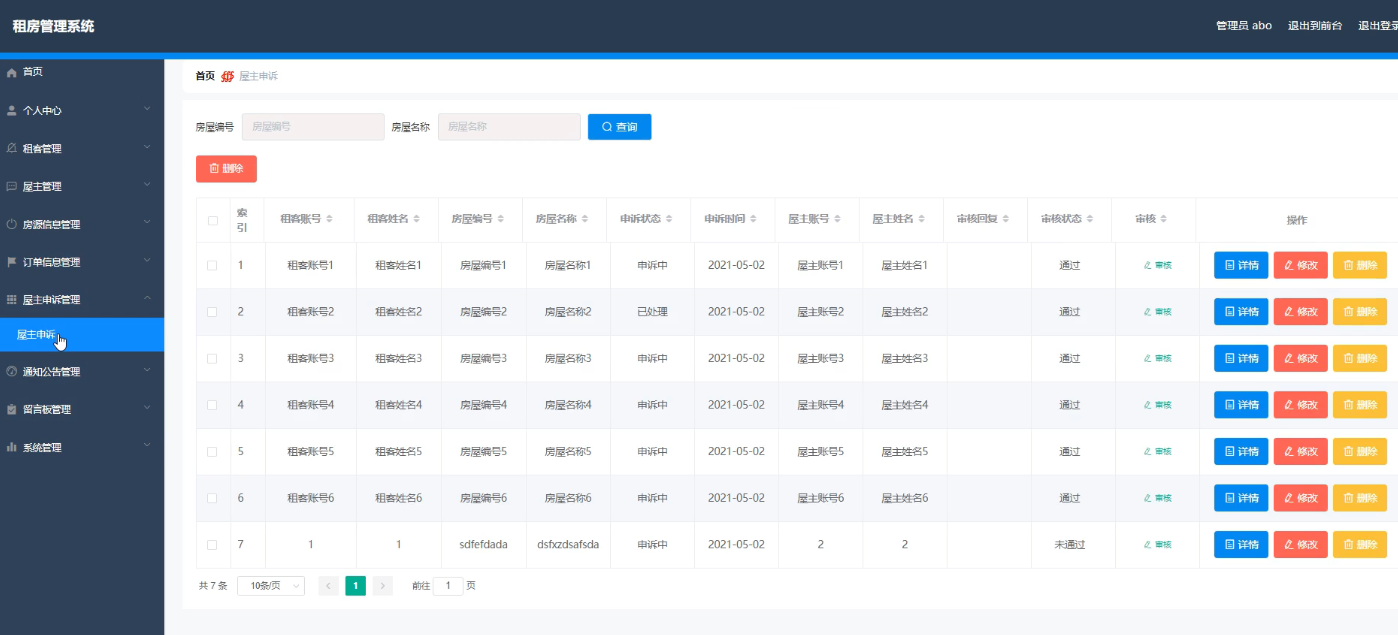 The rental management system has three roles: administrator, tenant, and homeowner. Administrator functions include personal center, tenant management, homeowner management, housing information management, order information management, homeowner complaint management, notification management, message board management, system management, etc. The homeowner publishes the housing information, the tenant makes an appointment to see the house, and generates an order. So it has a certain practicability.
